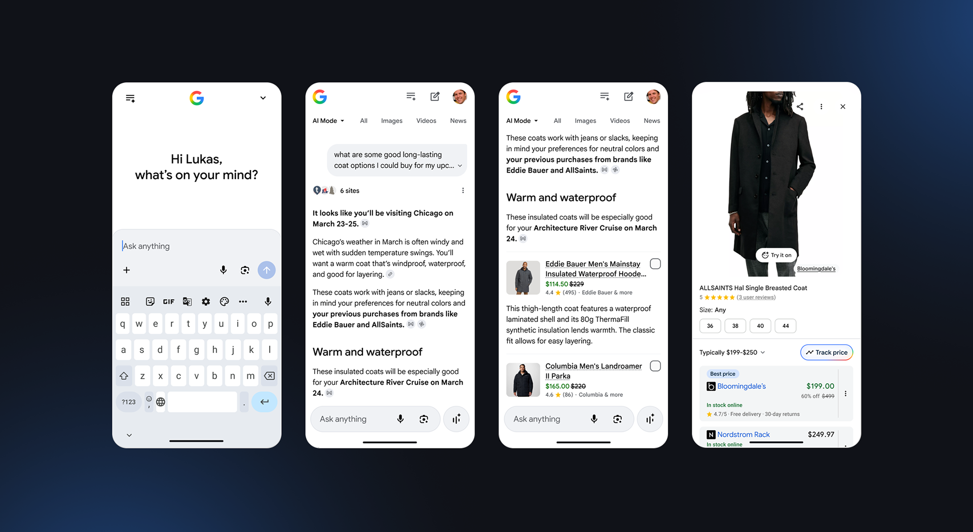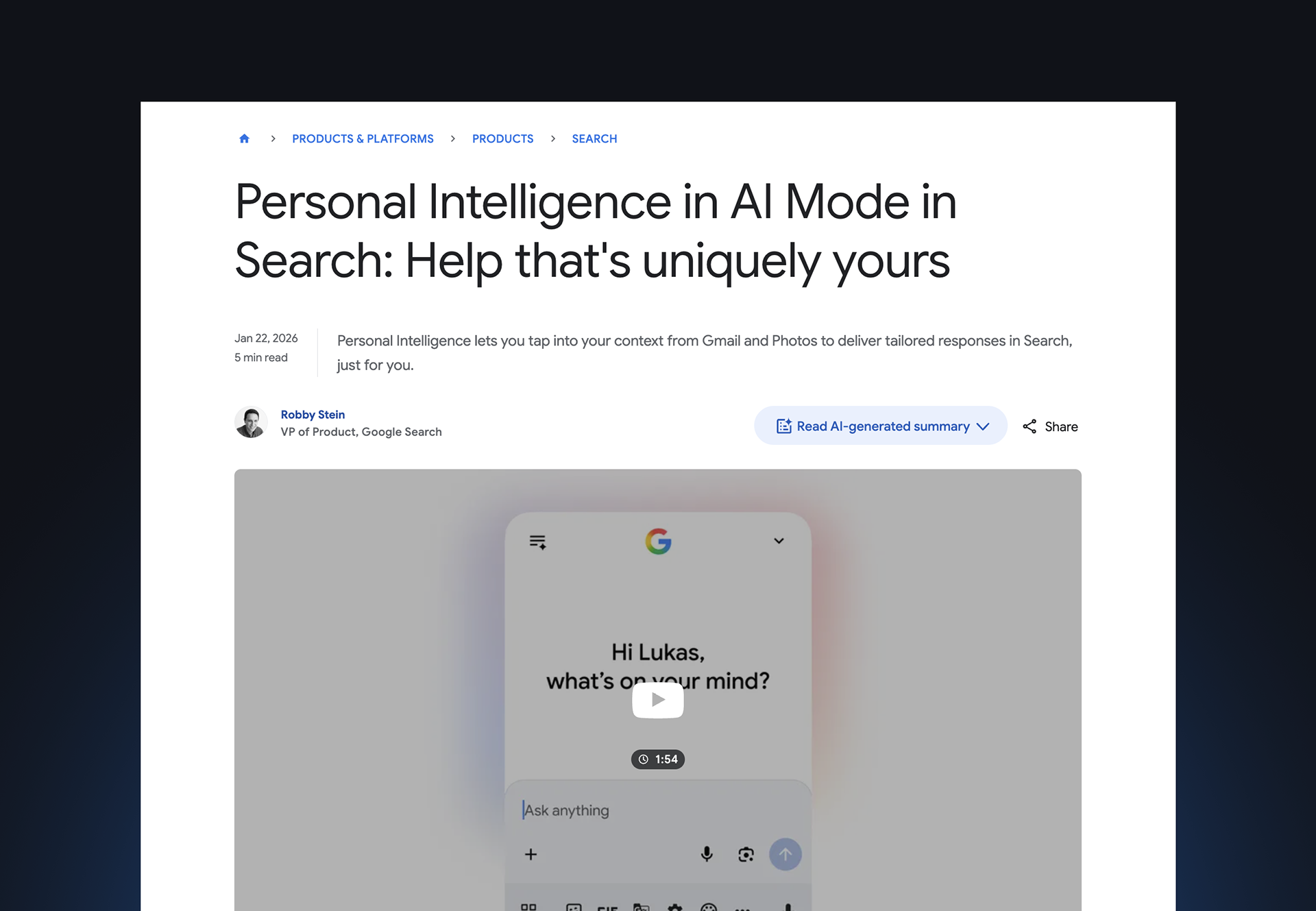 Working closely with Product and Marketing, I designed high-fidelity UX product flows for the Personal Intelligence in AI Mode feature release. I served as the design liaison between Product and Marketing, ensuring new AI capabilities were accurately featured in Google's "The Keyword" blog post, exec social accounts, and press.